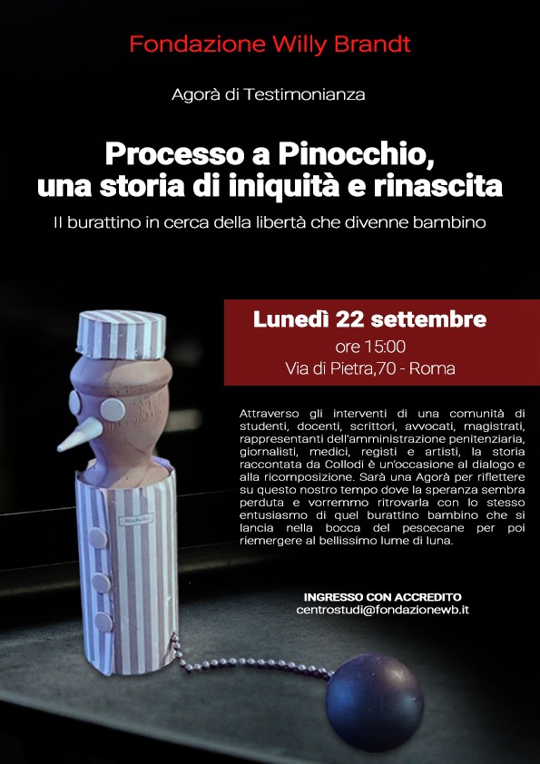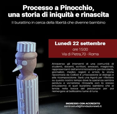 In questo convegno, esploreremo il processo di Pinocchio come metafora esistenziale e di una giustizia che, piuttosto che indicare la strada per la libertà, antepone la propria esistenza e autoritarismo al buon senso e alla autorevolezza così da trasformarsi in una caricatura di sé stessa.
