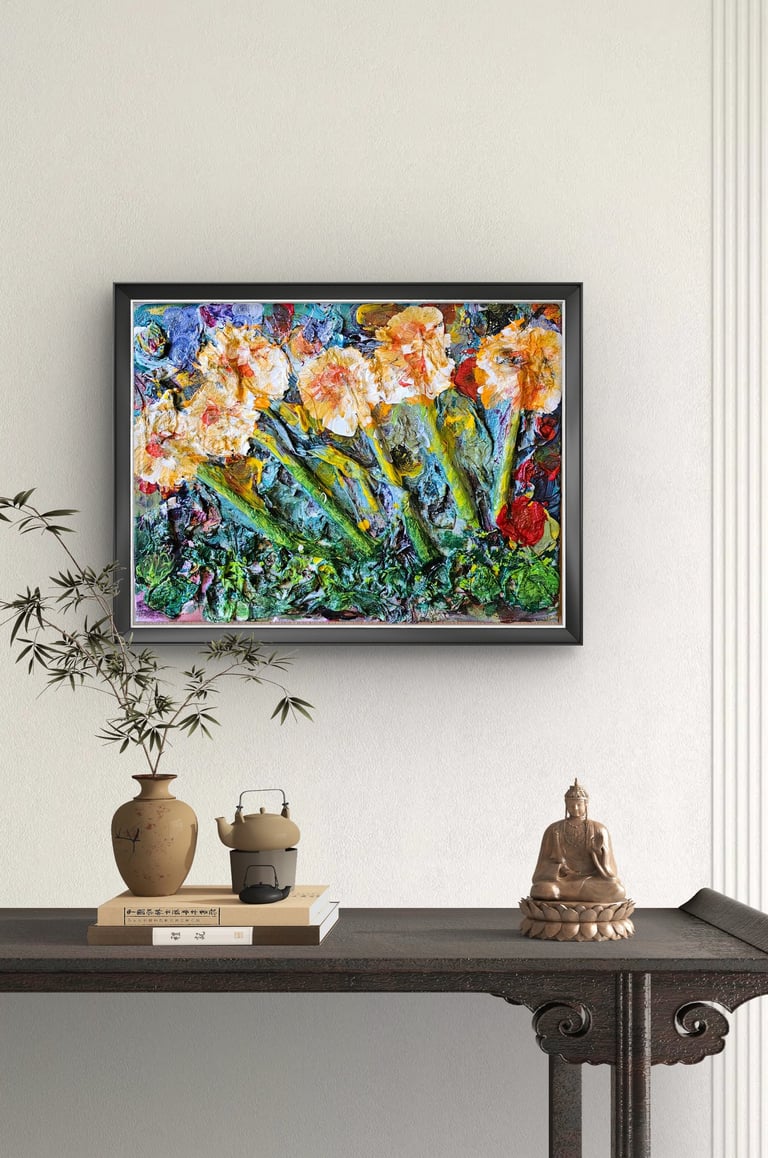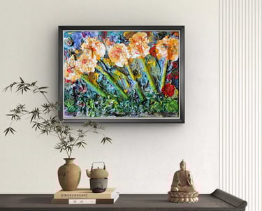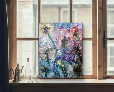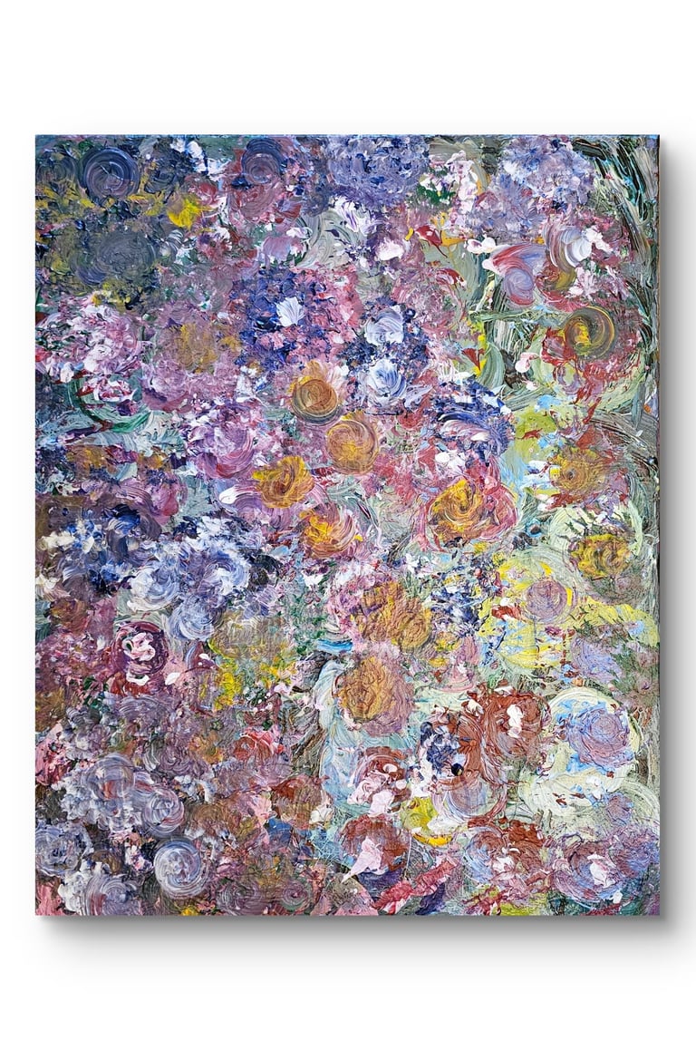 Questa realizzazione artistica è eseguita con acrilici su tela, dando vita a una texture ricca e vibrante. L'artista autodidatta impiega una disposizione circolare e vorticosa dei colori, creando un effetto tridimensionale unico. L'opera, datata 2025, appartiene al modernismo e si contraddistingue per la composizione astratta dai toni multicolori, incorniciando un'esplosione visiva dinamica e armoniosa. L'artista nei suoi dipinti lega le memorie visive ed olfattive e in questo caso l'avvolgente fragranza dei gelsomini, sensuale e fresca, viene rappresentata con fiori disposti in modo apparentemente caotico